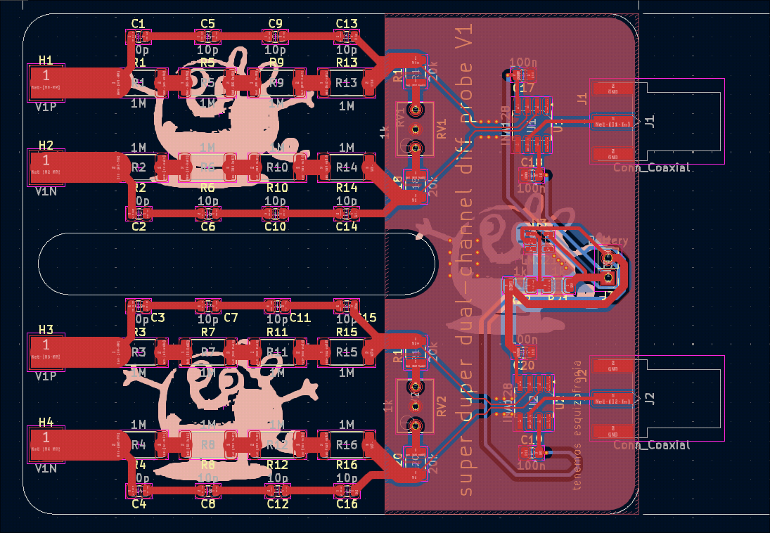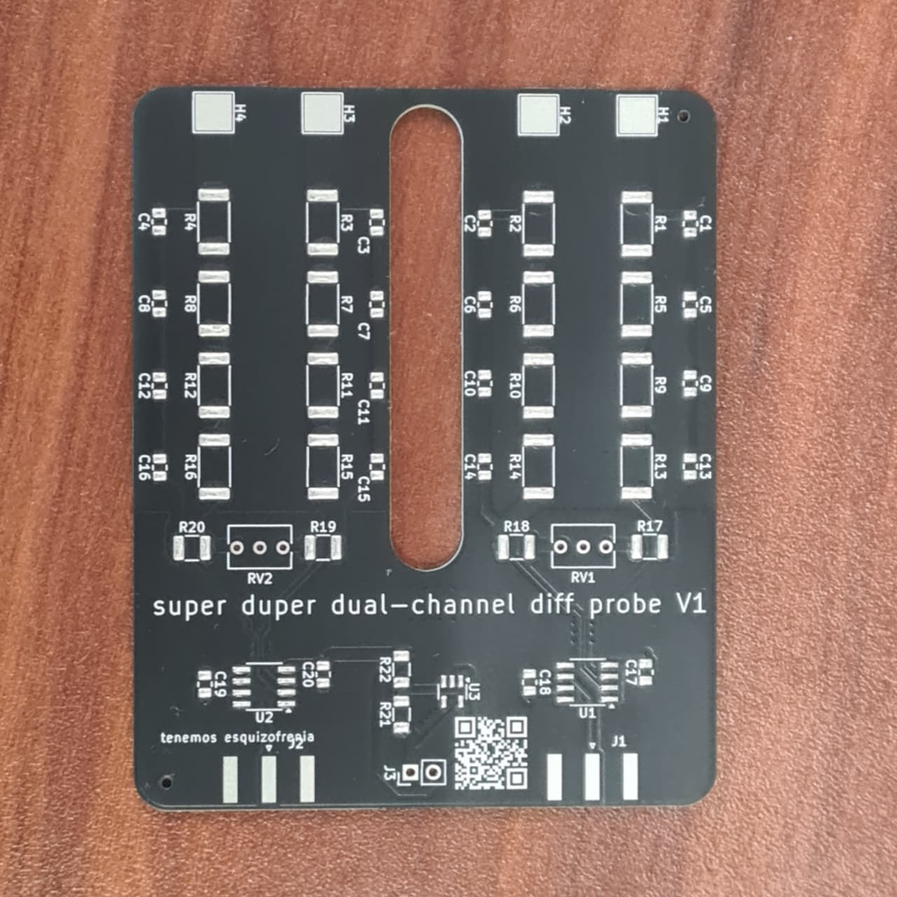 This is a differential probe PCB designed in KiCad. The main goal of this project was to create a high-precision differential probe that can be used for measuring high voltage signals safely by having different ground references. Also in my power electronics class there werent enough differential probes available for students to use, so I decided to design my own making this project born out of necessity.